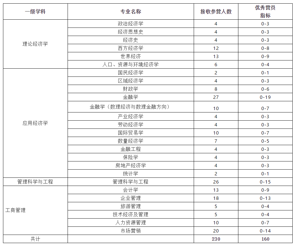 为促进高校优秀大学生之间的学习与交流,增进校外优秀大学生对武汉大学和经济与管理学院的了解,激发优秀学子对经济学科与管理学科学习和研究的兴趣,选拔校外优秀本科生进入武汉大学经济与管理学院攻读学术型硕士学位,根据武汉大学《关于深化培养机制改革全面提升学位与研究生教育水平的若干意见》(武大字[2017]4号)和《关于举办2020年优秀大学生线上夏令营活动的通知》等文件精神,武汉大学经济与管理学院将举办2020年优秀大学生线上夏令营活动。 本届夏令营活动将于7月20日-22日线上举行,为期3天。 1 申请条件 1.“双一流”建设高校本科三年级在校生(2021届毕业生),或本科专业(不含辅修专业)所属一级学科在教育部第四轮学科评估排名为“B+”以上(含)的本科三年级在校生(2021届毕业生),或国外高水平大学本科三年级在校生(2021届毕业生); 2.大学本科期间专业为经济学或管理学类。非经济与管理类专业学生需辅修过经济学类、工商管理类以及管理科学与工程类专业双学位; 3.学习成绩优异,本科前五个学期学习成绩在本专业年级排名位于前15%之内,国家经济学基础人才培养基地学生、高水平试验班学生和有突出科研成果者(如有科研论文发表在核心及以上重要期刊),可适当放宽至20%。所有申请者专业必修课成绩均须及格以上; 4.对所报专业领域的科学研究有浓厚的兴趣,有较强的科研潜力; 5. 熟练掌握英语,并至少满足以下其中一项条件:国家英语六级水平考试成绩425分以上;雅思成绩6.5分以上;TOEFL成绩80分以上; 6.身心健康。 2 申请材料 请严格按照以下顺序整理: 1.《武汉大学经济与管理学院2020年优秀大学生线上夏令营申请表》(以下简称《申请表》,附件1)1份(《申请表》上须有本人签名、所在院系推荐意见和学校教务部门盖章); 2.《武汉大学经济与管理学院 2020年优秀大学生线上夏令营个人陈述》1 份 ( 以下简称《个人陈述》,见附件2 )(需本人签名); 3.《武汉大学经济与管理学院 2020年优秀大学生线上夏令营诚信承诺书》(见附件3),需本人亲手签名; 4.其他材料: ①身份证、学生证复印件 ( 复印 A4 纸的同一面上 ); ②前五个学期的大学学习成绩单原件,须加盖申请者本人所在学校教务部门的学习成绩专用章; ③本科学院(系)出具的前五个学期专业成绩排名以及年级总人数情况证明; ④英语水平证明:国家六级考试成绩或 TOEFL/GRE/GMAT/IELTS成绩复印件等(已在境外高校就读的学生可不提供英语水平证明); ⑤体现自身学术水平和研究潜力的学术科研成果复印件(如公开发表的科研论文。科研论文需第一作者,提供复印封面、目录和文章全文;科研项目需提供项目结项证明或立项书 ); ⑥各类证书(省级以上获奖证书和奖学金等)复印件; ⑦其他(辅修双学位证书等) 3 申请方式 1. 网上申请 6月24日开始,申请人登录“武汉大学研究生招生服务平台(http://yz.whu.edu.cn)”(以下简称“夏令营系统”,请使用Google Chrome浏览器),选择“优秀大学生暑期夏令营申请选拔”报名项目,根据系统要求在线填写申请表和个人陈述,并上传照片。 2. 纸质材料提交 申请人请于7月6日前将以下材料寄(或送达)至湖北省武昌区武汉大学经济与管理学院B136办公室 余老师(联系电话:68753847),因疫情原因,仅接受顺丰和EMS快递。 网上申请上传的所有证明材料与纸质提交材料须真实有效,如有作假行为,一经发现,取消夏令营营员资格。 4 营员审核 材料审核和营员选拔工作由学院组织工作专班负责,由学院制定录取规则和标准。学院将根据学生提交的申请材料,对照申请条件,依据公布的参营人数,确定夏令营参营名单并报研究生院审核。 审核通过的夏令营参营名单在经济与管理学院网站公布(学生本人可通过“夏令营系统”查询)。已被选拔的营员要在参营名单公布之日起3日内(7月14日前)通过“夏令营系统”确认是否参加,逾期未确认视为放弃入营资格。 5 优秀营员计划接收指标 计划接收参营营员人数为230人(限校外),“优秀营员”人数160人左右。各专业接收指标如下: