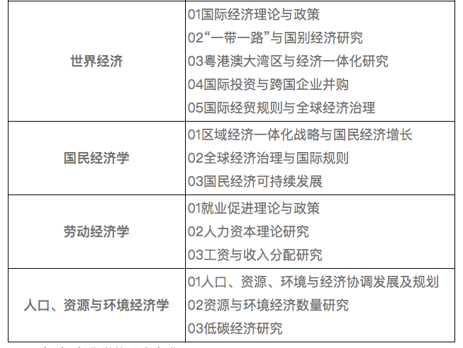 学院拥有理论经济学、应用经济学两个一级学科硕士学位授权点,下设国际贸易学、产业经济学、区域经济学、财政学(含税收学)、经济史、世界经济、国民经济学、劳动经济学和人口、资源与环境经济学九个二级学科硕士点。