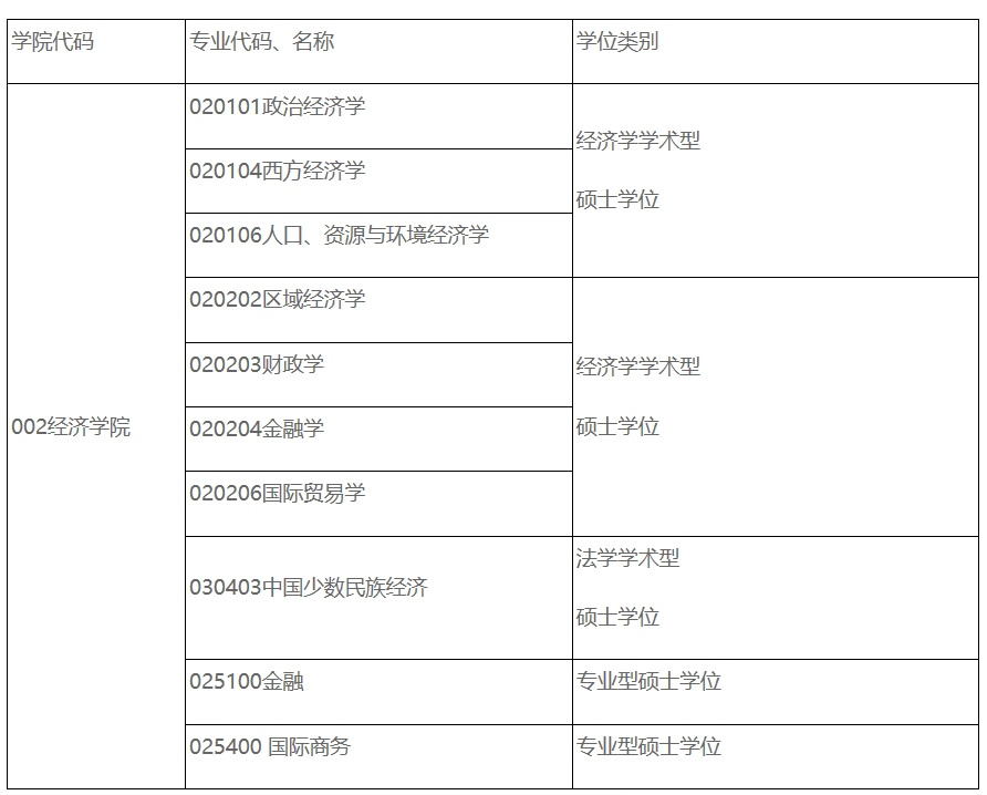 学院具有从本科、硕士到博士研究生和博士后的完整人才培养体系。有中国少数民族经济二级学科博士点和硕士点。有理论经济学和应用经济学两个一级学科硕士点,下设政治经济学,西方经济学,人口、资源与环境经济学,区域经济学,金融学,国际贸易学、财政学7个二级学科硕士点;有金融硕士和国际商务硕士两个专业硕士点。其中,中国少数民族经济为国家重点学科;理论经济学为国家省部级重点建设一级学科,区域经济学为国家省部级重点建设二级学科。经济学专业2019年入选国家一流专业,理论经济学全国软科排名第36名。